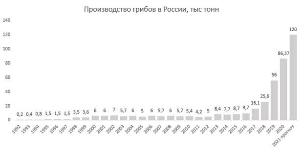 Результаты не замедлили сказаться. С 2015 по 2020 производство грибов в России выросло в 10 раз. В среднем по 50% в год. В 2021 году ожидается рост отрасли ещё на 38,9% до 120 тысяч тонн. Вполне возможно, в 2022 году рост будет ещё больше. С начала 2021 грибная продукция и мицелий грибов будут облагаться нулевым налогом на прибыль благодаря своему новоприобретенному статусу сельхозпродукции.