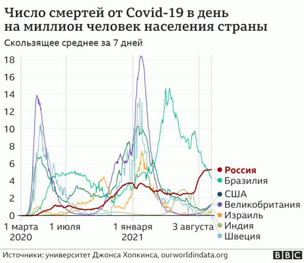Вместе с тем в странах, где население проявило ответственность и вкололо себе вакцину, смертность за последние месяцы резко снизилась (вначале почти до нуля, затем пошла волна дельта-штамма – неприятная, но благодаря прививкам куда менее смертоносная):